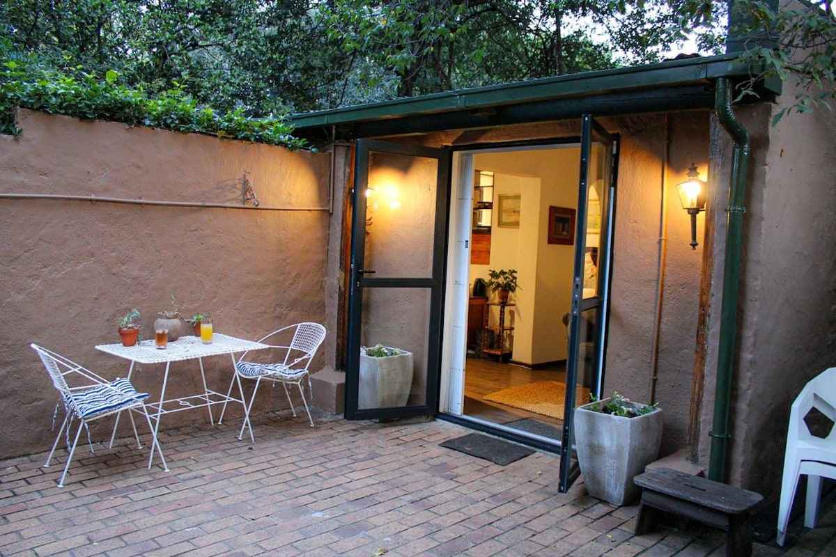 Recently renovated cottage by the pool with double bed with lounge area and a private braai area, kitchen, sofa bed and work station. ✔ Pool next to lush garden ✔ 50Mpbs+ WiFi ✔ Smart TV with Netflix ✔ Shaded parking for two vehicles ✔ Work space with ethernet connection ✔ Washing machine ✔ Dishwasher ✔ Fridge ✔ Gas Stove ✔ Microwave Oven ✔ Fully loaded kitchen utensils. Situated in a central location and close to all amenities. Suitable for three people. Suitable for long term stay as well.