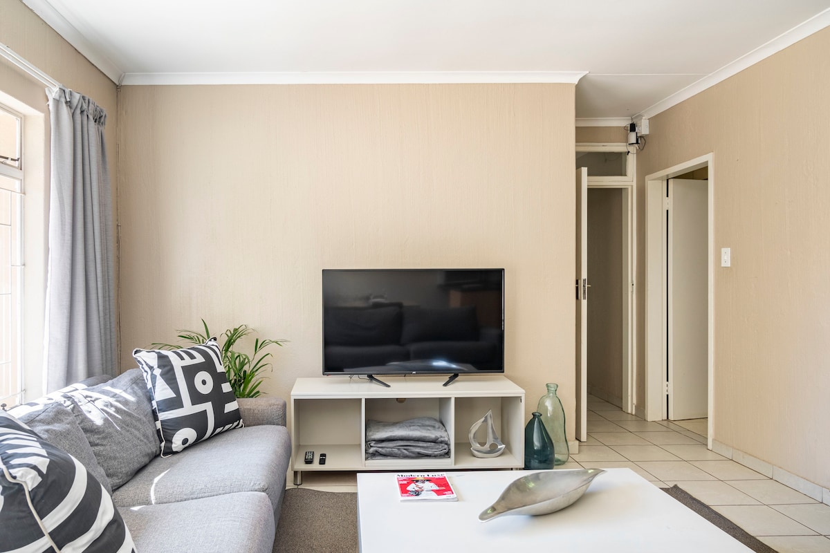 Experience modern, stylish comfort in our 56m² one-bedroom, one-bathroom apartment in Bryanston. Designed to accommodate up to two guests, the apartment features a bedroom with a queen bed, a bathroom with a walk-in shower, and an open-plan lounge and dining area, Air Conditioning and small balcony. Fully equipped designer kitchen allows for effortless self-catering, Smart TV, with access to Netflix, DSTV, Showmax, and Amazon Prime Video ready (Own Login).
