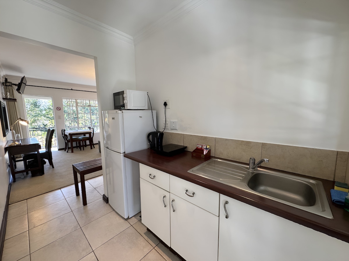 Clean, streamlined, modern studio with back-up power and back up water and free fast wi-fi. Suitable for single person only. Kitchen with micro-wave, kettle toaster, and fridge but no cooking facilities/stove or hob. Double bed and ensuite bathroom (walk in shower). Flat screen TV with Net Flix, work station and dining area. Parking adjacent to unit. Communal swimming pool. Serviced daily including personal laundry. No service or laundry charge.