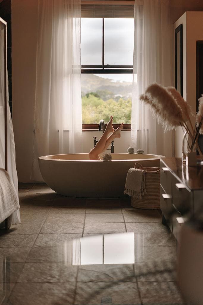This is one of Cape Town's environmental and historic treasures. It is a candle-lit hideaway with stunning views of mountain and sea. The Cottage is completely off grid, with fresh water coming off the mountain and energy from the sun. The cottage is built from local materials - stone walls, reed ceilings, blue gum supports. There are glass doors and windows throughout the cottage. The cottage has a beautiful open-plan bedroom and bathroom. The bathroom includes a tub, a toilet and a basin.