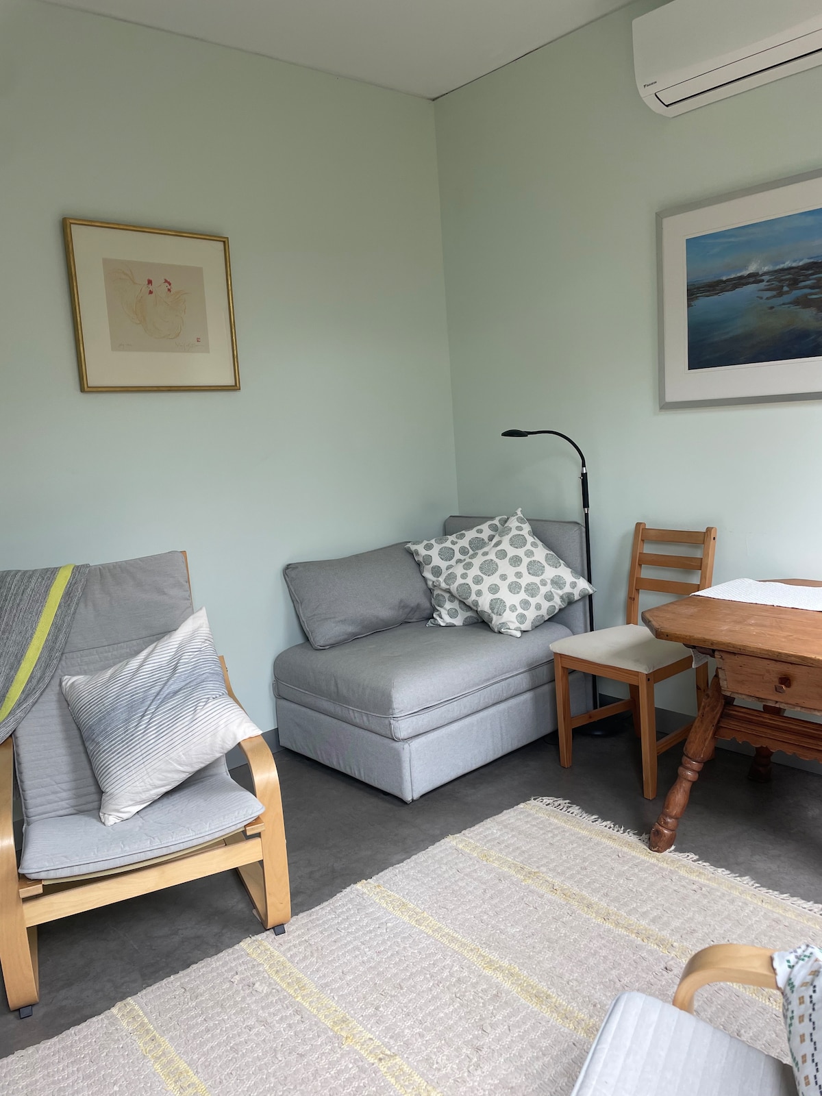 Architect designed energy efficient house, with the private apartment attached, a view from every window. There is a separate bedroom, separate sitting room, separate bathroom, small kitchen, washing machine, Aldi coffee machine, and microwave, air fryer, oven combination, and a 2 plate stove Separate entry. Private unfenced garden that is also part of of a native tree reserve with access to footpath, and walking paths to beach, 1km and a delightful bush track 2 km to cafe No Children. No dogs