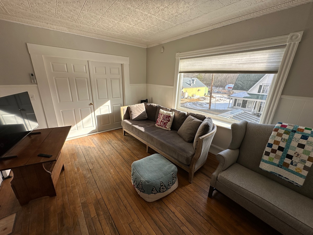 Enjoy this cozy, newly renovated apartment, in the original “Main Street Market and Provisions” building in downtown Rangeley, Maine. This space is perfect for a family of 4 with queen bedroom and twin/twin bunks, with all new appliances, dishwasher and washer/dryer. Easy walking distance to all shops and restaurants, 9 miles to the base of Saddleback Mountain. We are right across the street from the public boat launch at Rangeley Lake Park with tennis courts, playground and swimming beach.