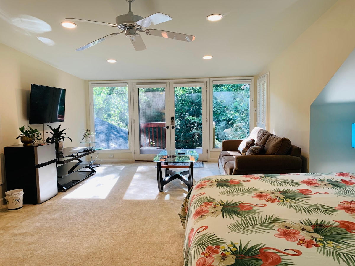 Spacious private basement guest suite with wooded & creek views in a quiet neighborhood with private entrance in a convenient location of North Atlanta / Sandy Springs. 3 Beds - King Bed - Queen Bed - Sofa Bed Sleeps up to 5 guests NEW upgraded Hi Speed internet with mesh router system. Powered standing desk. NEW queen & sofa bed mattresses. Does not include a kitchen sink, stove or oven. Convenient location to interstates, shops, dining and other parts of Atlanta. Great Value!