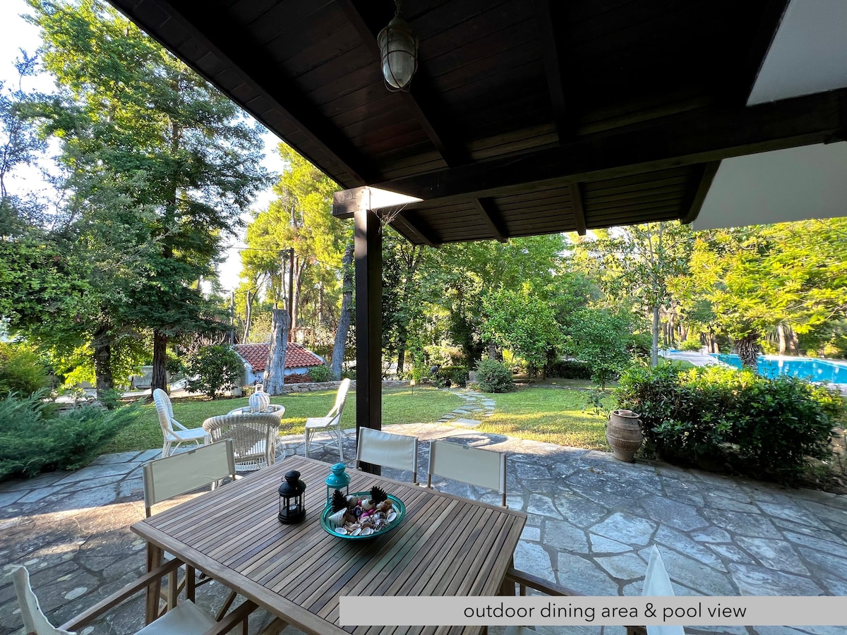 Sani is a bustling seaside village known for its summer art festival, with folk and pop music concerts around a nearby hill, topped by the 16th century Stavronikita Tower. . On the neighboring coast there are several beach resorts, while a short path through the pines leads to a quieter area of sand and shallow water.the house is traditional and located in the forest distance from the beach 700 meters is a place to relax and enjoy nature