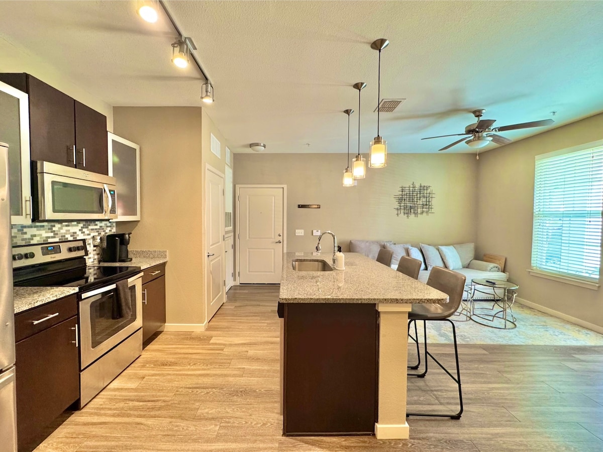 Welcome to our stylish oasis in Kissimmee, which seamlessly blends sophistication with a laid-back vibe. Your stay begins in a professionally cleaned apartment for your full enjoyment. Discover resort-style amenities – a sparkling pool, a fitness center, and hammocks, offering the luxuries of a five-star retreat. Conveniently located with in walking distance of theme parks, restaurants, and shopping. Book now. We can't wait to host you in our little slice of paradise!