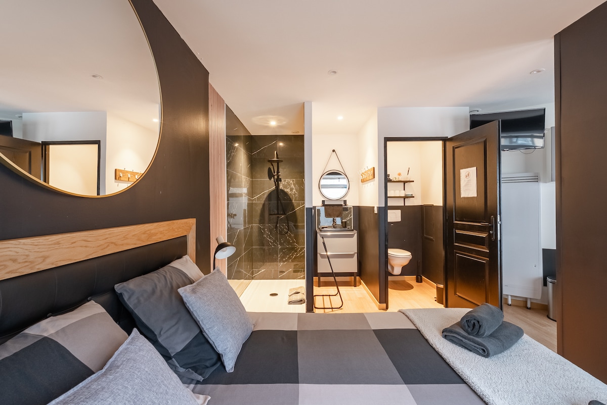 Une suite de 30m2, consacré à la détente. Notre gîte est composé d'une entrée desservant les WC Un espace cuisine équipé(frigo, plaque a induction portative, machine a café, bouilloire, grille pain, four micro ondes, vaisselle) Un lit Queen size 160x200 Un écran plat 138cm connecté Une cheminée électrique avec flammes, Un espace salon cosy Une salle d'eau végétale avec sa vasque en pierre et sa grande douche tropicale avec luminothérapie, une balnéo 2 places, avec radio et bluetooth intégré.
