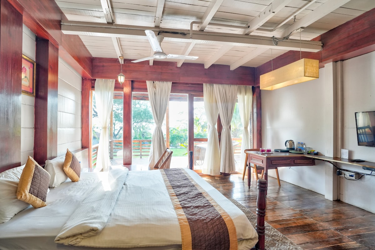 Embraced by the breath taking beauty of tropical landscapes, our air-conditioned rooms radiate elegance, showcasing antique wooden furnishings, plush woven carpets, and remarkable craftsmanship. The room features a magnificent 150-175- year-old antique king bed and wardrobe, providing a cozy retreat for two adults, with the option to add an extra bed for enhanced comfort. Delight in your own private sitting area, beautifully appointed with a luxurious sofa set etc..