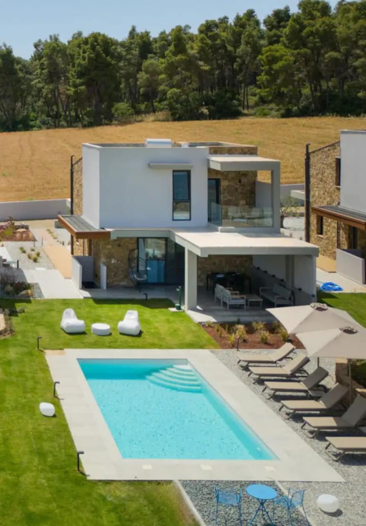 On a hill in the traditional village of Nea Fokaia in Kassandra, Chalkidiki, those modern stone houses are built in harmony with the landscape. The view from the swimming pool area is expanding towards the olive trees and sea and the access to the nearest beach is an only seven-minute walking distance. Those modern stone villas with private pool create a relaxed and restful environment. They are light and airy designed in alignment with indoor-outdoor living concept.