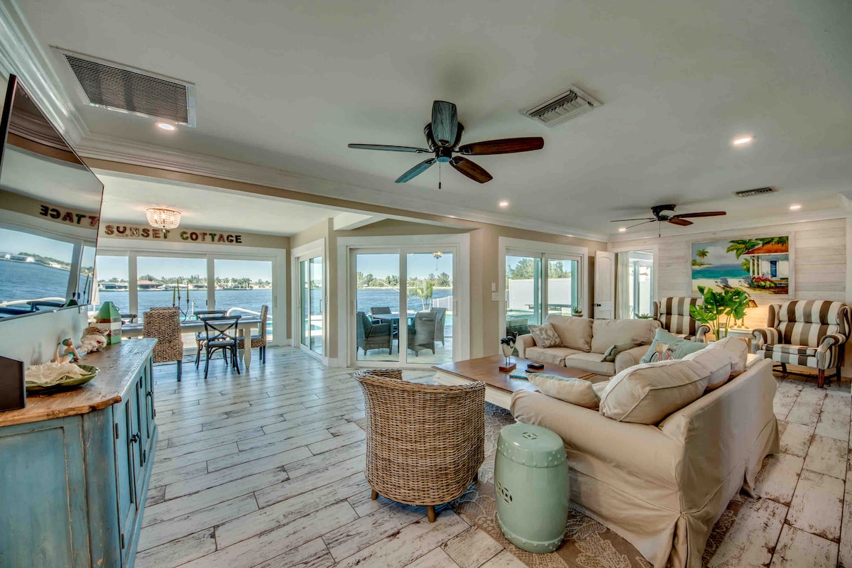 Update: In September 2022 we were affected by Hurricane Ian. We had just over 5 feet of flooding in our treasured cottage. We have worked tirelessly to put everything back together. All new tile, walls, electric, lighting, furniture, and we even improved the bathroom! Spacious tropical home with water view from our back yard lanai. Boat Dock with Cleaning Fish Station, BBQ beautiful sunsets with fish jumping in our canal. New large kitchen and one block from art galleries, restaurants and bars.