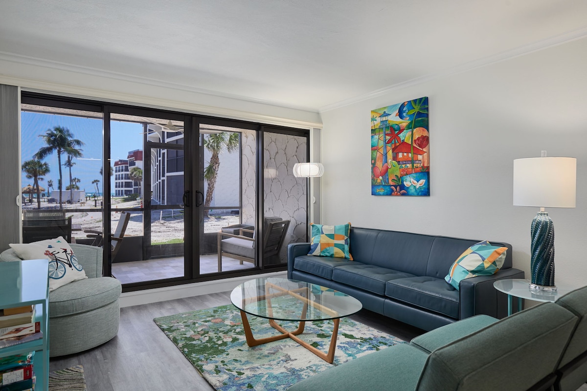 On the beach with top floor ocean views! Enjoy sparkling ocean views from this relaxing coastal retreat, just steps from the beach. This large condo sleeps 4 and was fully renovated to include an expanded custom kitchen & luxury bathroom with large walk-in shower. Top of the line coastal furnishings in every room. The spacious master bedroom offers gulf views, king bed and a full-size desk if you need a quiet space to work. WiFi has been fully upgraded to make streaming and video a breeze.