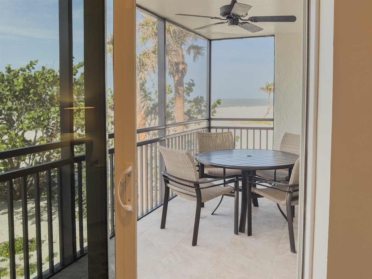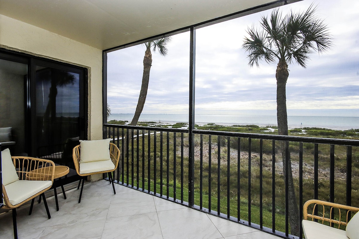 We are a Superhost for a reason! Sanibel Siesta looks amazing! Immaculate beachfront, 2BR, 2BA w/garage, nicely updated beachy unit at sand's edge. Cooks kitchen. Amazing views of the Gulf w/5 star ratings! 3-day min. New hurricane windows, nicely furnished with ELEVATOR IN BUILDING! Discount for weekly/mo. rentals. BR 1:King bed ensuite, smart TV. BR 2: 2 tw. beds, smart TV. Qn. sofa bed in LR. Pool, golf course, bikes, laundry on site. No food or condiments stored in unit. May allow sm. dog.