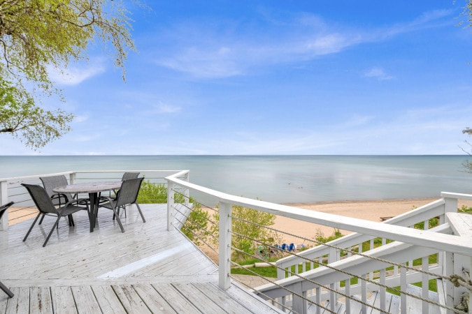 Take a break and unwind at this peaceful oasis. Wake to gorgeous sunrises over Lake Huron and fall asleep to the soothing sound of waves. Relaxing escape. Enjoy private access to a spacious beach just steps from your back door, perfect for searching for petoskey stones or unwinding by the water. The large lot features a bonfire pit with stunning lake views, creating the ideal setting for cozy evenings under the stars. Inside, panoramic lake view with a massage chair to elevate your relaxation.