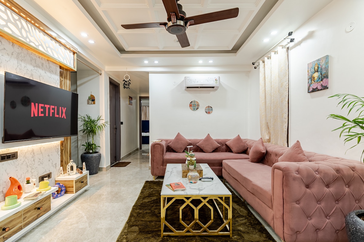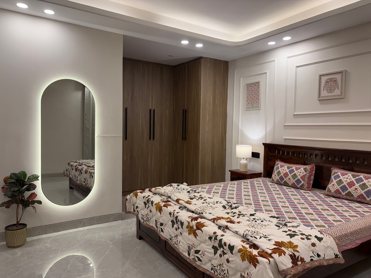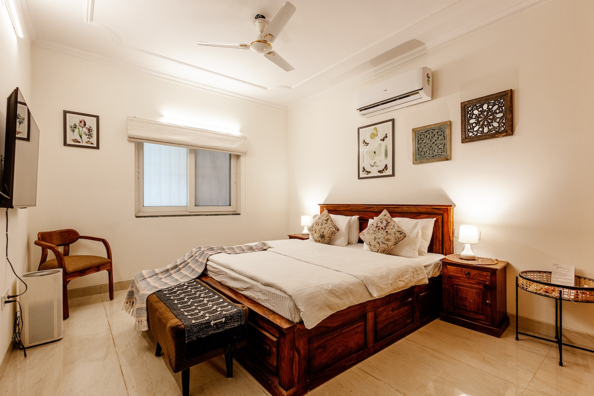 Stay at our spacious 2BR Park-View Retreat, 8.5 km from airports & 15 min ride to the metro. Enjoy airy balconies, park views, mahogany/wooden beds, a fully-equipped kitchen, high-speed Wi-Fi, Smart TV, complimentary toiletries, & local recommendations. Relish home-cooked meals, explore nearby market & malls, and unwind with serene jogging paths. Experience top-notch hospitality with flexible check-in/out, laundry services & optional airport transfers. Book now for a memorable Delhi stay!