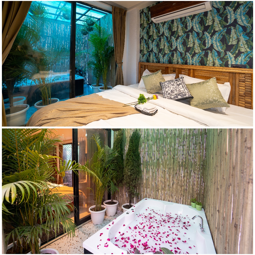 Escape to our stylish retreat, perfect for couples seeking relaxation and romance. Enjoy a private in-room jacuzzi, soothing steam sauna, and a premium shower area. The thoughtfully designed interior creates a warm ambiance, while the chic private terrace garden offers a cozy space for evening relaxation. Located near Deer Park, where you can spot deer and peacocks on tranquil walks. Note: Decorations are not included in the booking and are priced separately