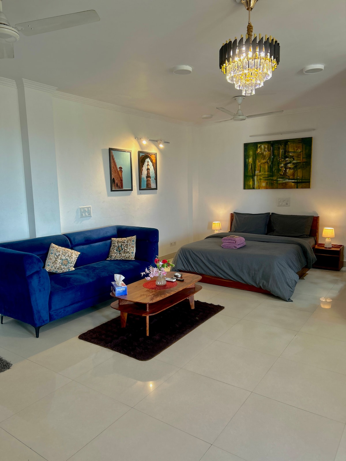 A very hygienic apartment in one of the most posh areas, The studio apartment (Bedroom + Kitchen + Bathroom) is completely independent and is operated by keys. Our studio apartments is furnished with foam mattresses, Smart TV, Refrigerator, Air conditioning. There is a fully equipped kitchen with stove, chimney, microwave, with all cooking and eating utensils, where you can cook your own meals as per your requirements. The availability of small stores for everyday needs is easily accessible.