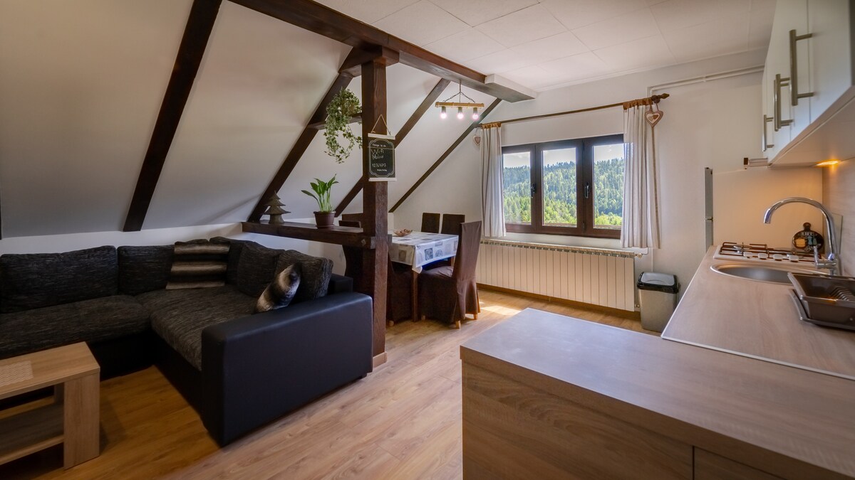 Uživajte sa svojom obitelji u ovom novo uređenom i modernom smještaju. Apartman se nalazi u potkrovlju stambene jedinice s prekrasnim pogledom na planine. Nalazimo se u blizini centra kao i u blizini NP Risnjak. Centralno grijanje. Unwind, relax and enjoy in this newly refurbished mountain loft apartment located in the centre of the village Crni Lug, near Risnjak National Park with stunning views of the forst and the mountains.