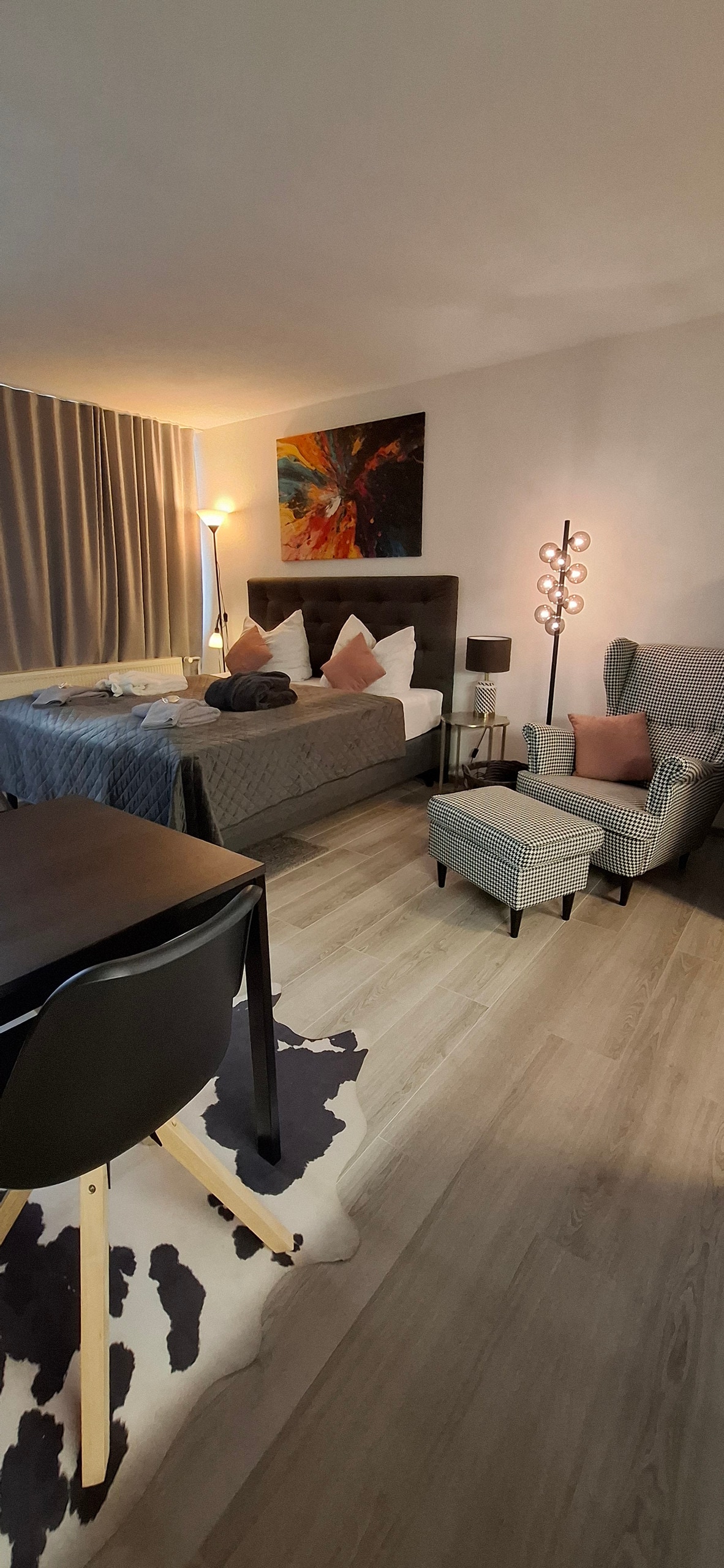Frisch renoviertes Apartement, liebevoll eingerichtet und gestaltet, ein Mix aus Space Age und Minimalismus. Atemberaubende Sonnenuntergänge und Himmelsstimmungen, bei klarem Wetter sogar mit Alpenblick. Die Wohnung befindet sich in einer einst architektonischen wegweisenden großen Ferienanlage aus den 70ern (Die Bauwelt von 1973 liegt im Apartement aus). Im Sommer mit Hängematte und Außenpool, im Winter mit Innenpool und Saunen. Ein Fitnesscenter gibt es auch im Haus. Alles inklusive.
