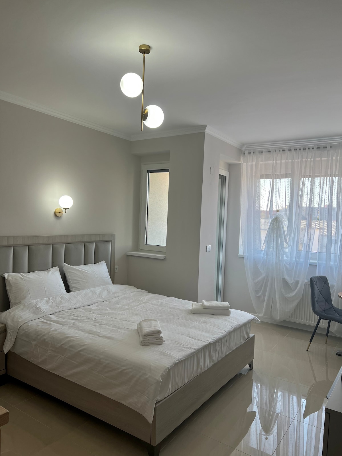 RegalBlue Apartament este situat la 500 de metri de aquapark President și de Spitalul de recuperare. Este un apartament de lux, complet utilat, care își propune să îți depășească așteptările. Vă puteți bucura de 2 smart TV care vin la pachet cu cont de Netflix pentru oaspeții care doresc să se relaxeze seara la un film, iar pentru copii am pus la dispoziție o consolă PlayStation 4 cu 2 manete și 4 jocuri. Pentru alte detalii sunați la zero șapte cinci cinci șapte cinci cinci șase opt opt.