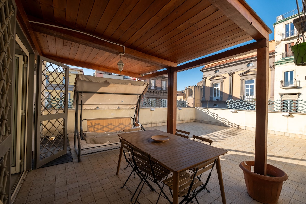 Spazia con lo sguardo sui tetti, sulle cupole di Napoli e sul Vesuvio dalle finestre di questo intimo appartamento con travi a vista e parete in mattoni, dove gli spazi interni, arredati in stile moderno, sono stati studiati per il massimo comfort. IL PALAZZO E' DOTATO DI ASCENSORE. Il terrazzo, condiviso con altri appartamenti, ti darà modo di riposarti dopo una giornata trascorsa alla scoperta della città.