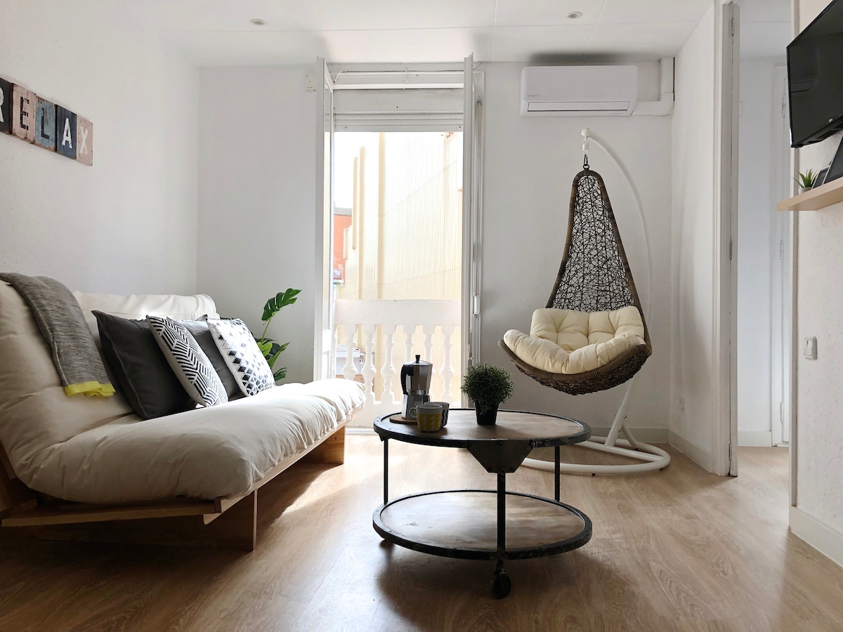 Encantador apartamento de diseño industrial boho a 15 min del centro en metro. Calle peatonal. Metro a 2 min. a pie. Playa a 20 min. andando. 1 hab. doble con salida a balcón y una habitación individual. Baño. Amplio salón con cocina full equiped y sofa futón cama para 2 personas. Tercero sin ascensor. Aire acondicionado frío/calor. Wifi high speed. Secador, plancha. Lavadora. Secadora. TV. Parking free en la calle. Encantador barrio con supers, mercado. Toallas y sabanas incl. 3º sin ascensor.