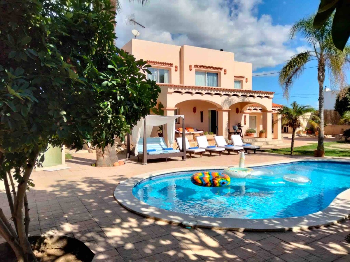 Centraal gelegen villa! Ideaal voor families een groepen. 5 minuten van het strand en alle hotspots (met de auto) * totaal 4 slaapkamers (allen met air heating) * Pellet stove fireplace * 3 net gerenoveerde douches * los appartement voor 2 (kinderbedje aanwezig) * Groot plot met bbq spot, zwembad en terrassen * Balinese stijl bar * WiFi 300mbs * Free parking faciliteit * Mooie centrale locatie; 10 minutes naar Ibiza stad, 5 min naar Playa d'en Bossa License: CCAA ETV1474E