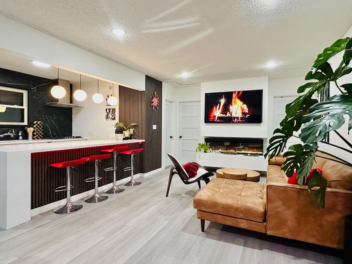 Relax and retreat in this modern mid-century style 3 BR/2 BA home located in a peaceful neighborhood near tons of shopping, dining, and event center. This house has an open floor plan, high ceiling, light-up color-changing pool, and spacious rooms. Outside, take a dip in the large pebble pool, there’s also an outdoor shower to rinse off, relax on the sunny patio, or enjoy organic lemons from the lemon tree. Take a walk, go for a picnic, or play tennis at the park which is just across the street!
