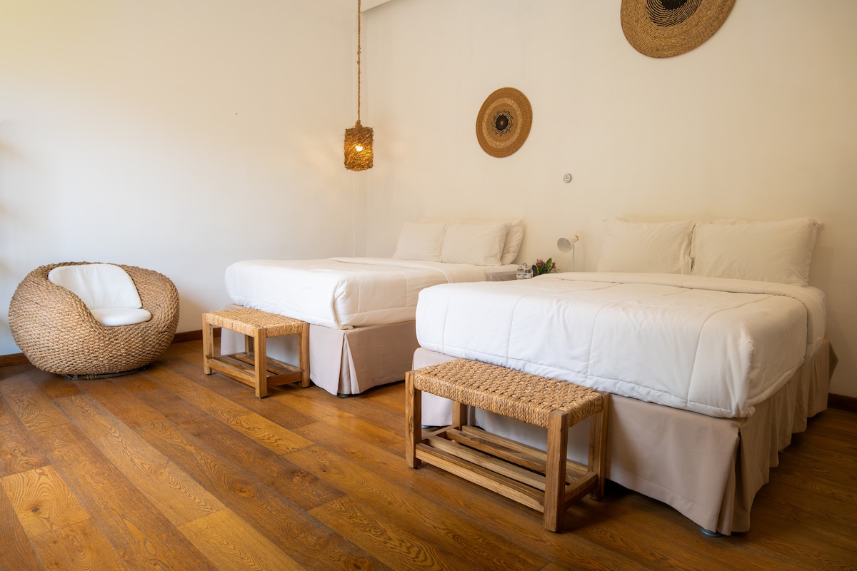 Our Signature Room reflects the essence of Equinoccio. Located in the original building with garden views, it blends Mediterranean-inspired architecture with handcrafted local details for a refined yet natural atmosphere. Includes 2 queen beds, quality linens, daily breakfast, and complimentary kayak and paddleboard use. Ideal for couples or travelers seeking comfort, authenticity, and a peaceful stay by the lake.