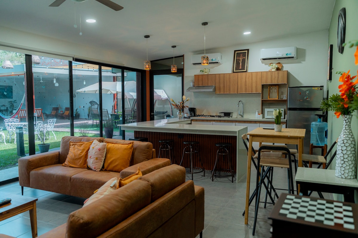 Un solo lugar para quedarte, lagos, ríos, bosques, volcanes, playa restaurantes, la capital, todo lo bonito cerca, estarás como y tranquilo como en casa, residencial privado donde puedes correr, relajarte en el jacuzzi de agua fresca (No caliente) con cascada o disfrutar de nuestro alojamiento totalmente equipado, TV, Aire acondicionado, Cocina, Wifi rápido, lavadora y secadora de ropa. etc: Si necesitas una ocación especial te la preparamos (Aniversario, luna de miel, cumpleaños. Etc).