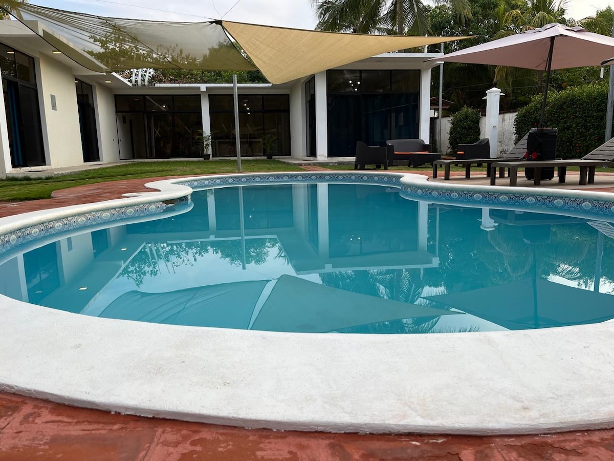 Recién construida, espectacular casa de playa frente al mar. Esta propiedad cuenta con casa principal con tres dormitorios con baño propio y aire acondicionado en cada habitación. El rancho social cuenta con baño, comedor principal, desayunador, y bar. Todo esto a unos pasos de una refrescante piscina de filtro. Los jardines son engramados y su verde espectacular contrasta con el azul del mar. La cocina esta completamente equipada con refrigerador, freezer, cocina y todos los utensilios.