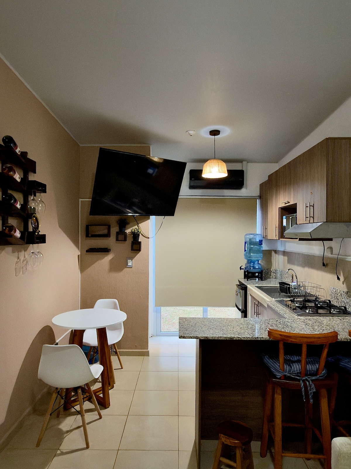 Enjoy a stylish experience at this centrally-located place. Clutter free house, private community, clean and comfortable in the heart of the most popular areas in Santa Ana. Short distance to Metrocentro Mall and Plaza Crystal. Enjoy watching movies in the air conditioned open space. Cook a nice meal in fully equipped kitchen or enjoy all the restaurants in the area that offer delivery to the community. Savor your morning coffee or evening wine in pergola covered patio with bistro lights.