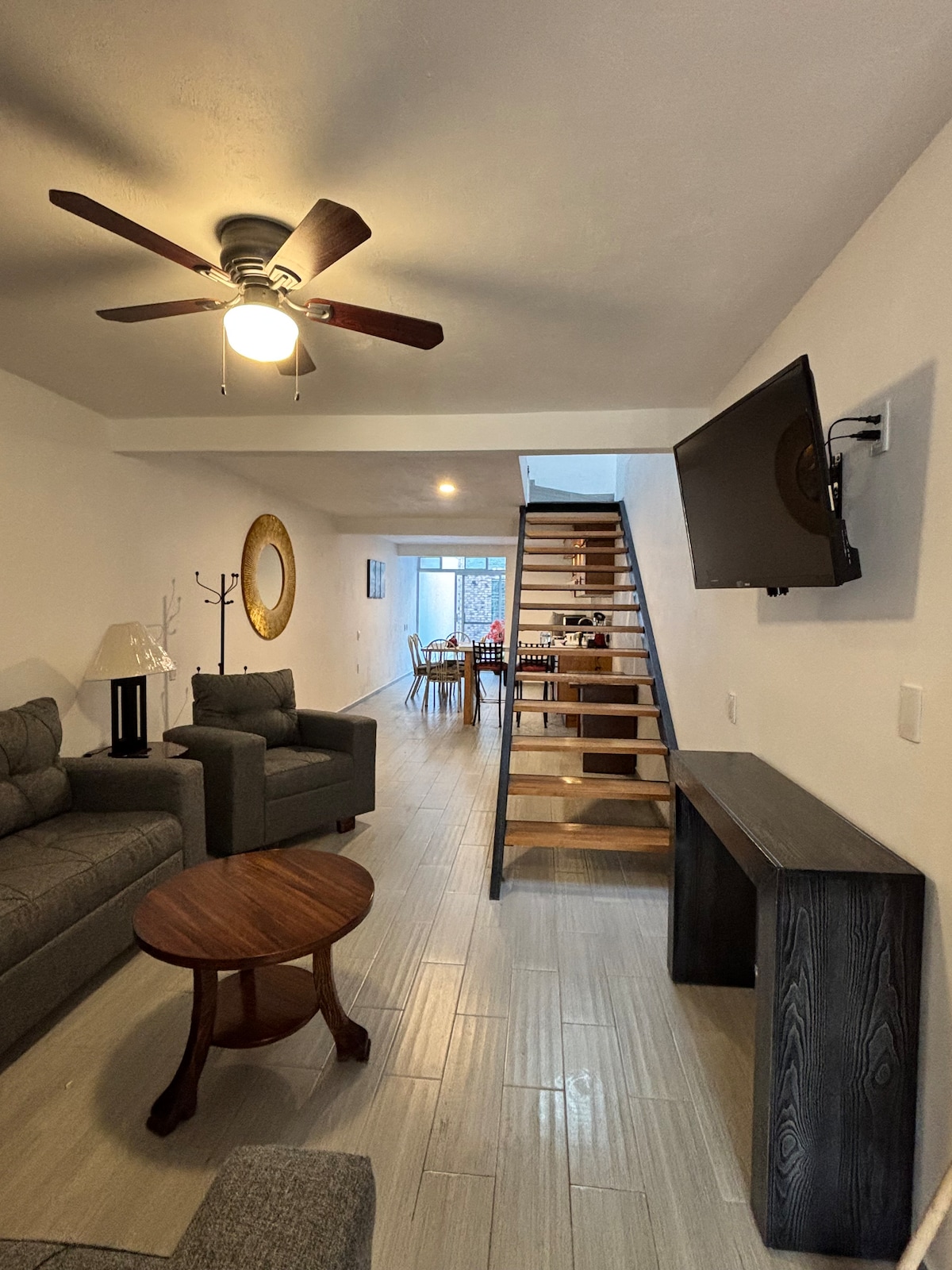 Disfruta de una estancia cómoda y moderna en este acogedor Airbnb ubicado en una de las zonas más tranquilas de Santa Anita. Ideal para viajes de descanso, trabajo remoto, o para un fin de semana. Este alojamiento ofrece espacios de iluminación natural y todas las comodidades que necesitas Se encuentra en planta alta, por lo que se requiere de subir escaleras para llegar Es un Airbnb ecológico, contamos con paneles solares para la luz y para el agua caliente