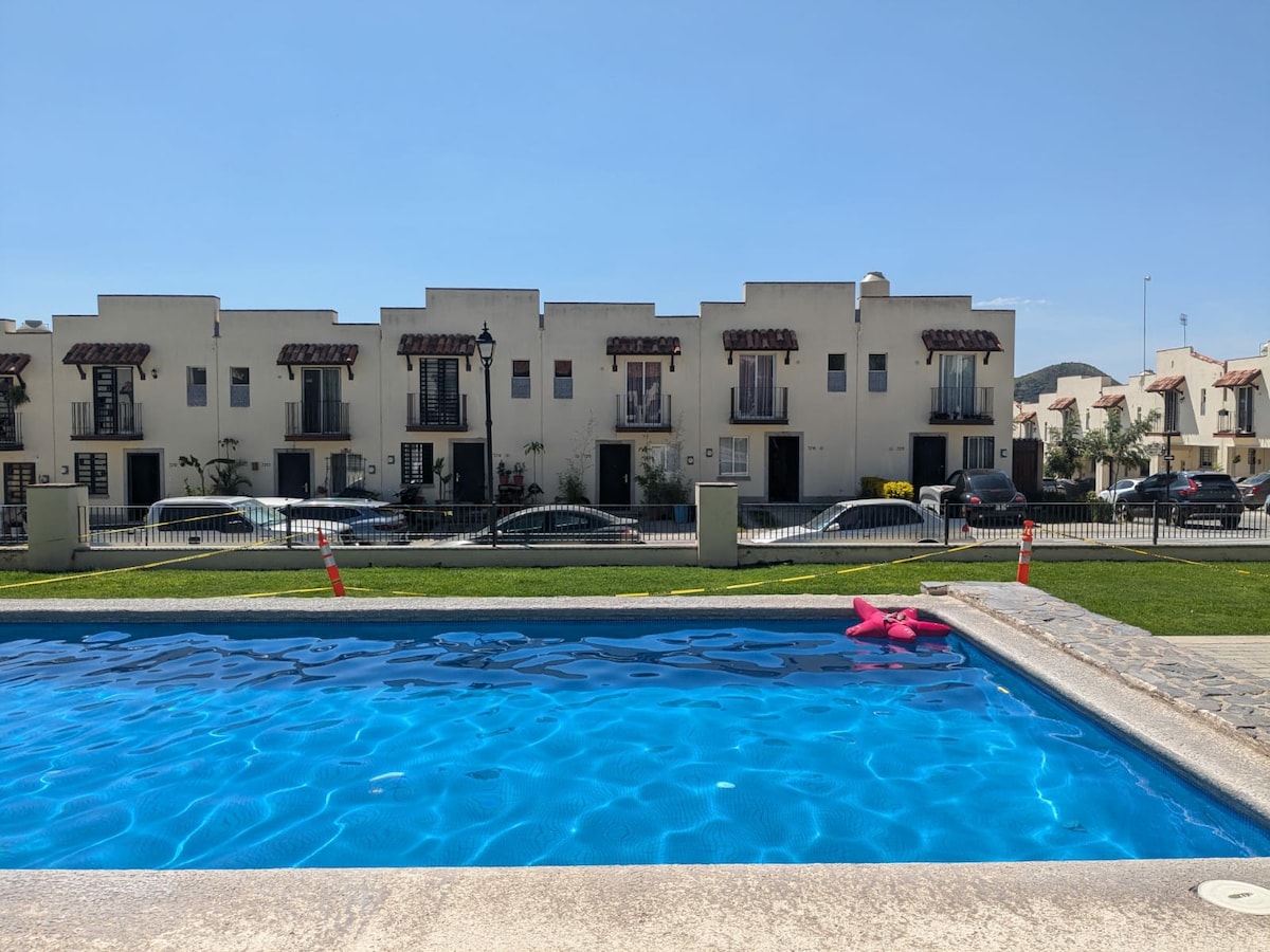 Relájate en este espacio tranquilo y elegante, ideal para pasar unos días de descanso. Con alberca privada climatizada ( 30 a 32 grados), relajante jardín, terraza abierta, cocineta y asador esta completamente equipada. Cuenta con 2 recamaras con un excelente diseño y preparadas para que disfrutes de un descanso placentero, con cama King en la principal y Queen en la segunda recamara ✔ Minisplit en ambas recamaras. ✔ Mini enfriador en recamara principal ✔ Internet en toda la casa de 500 Megas