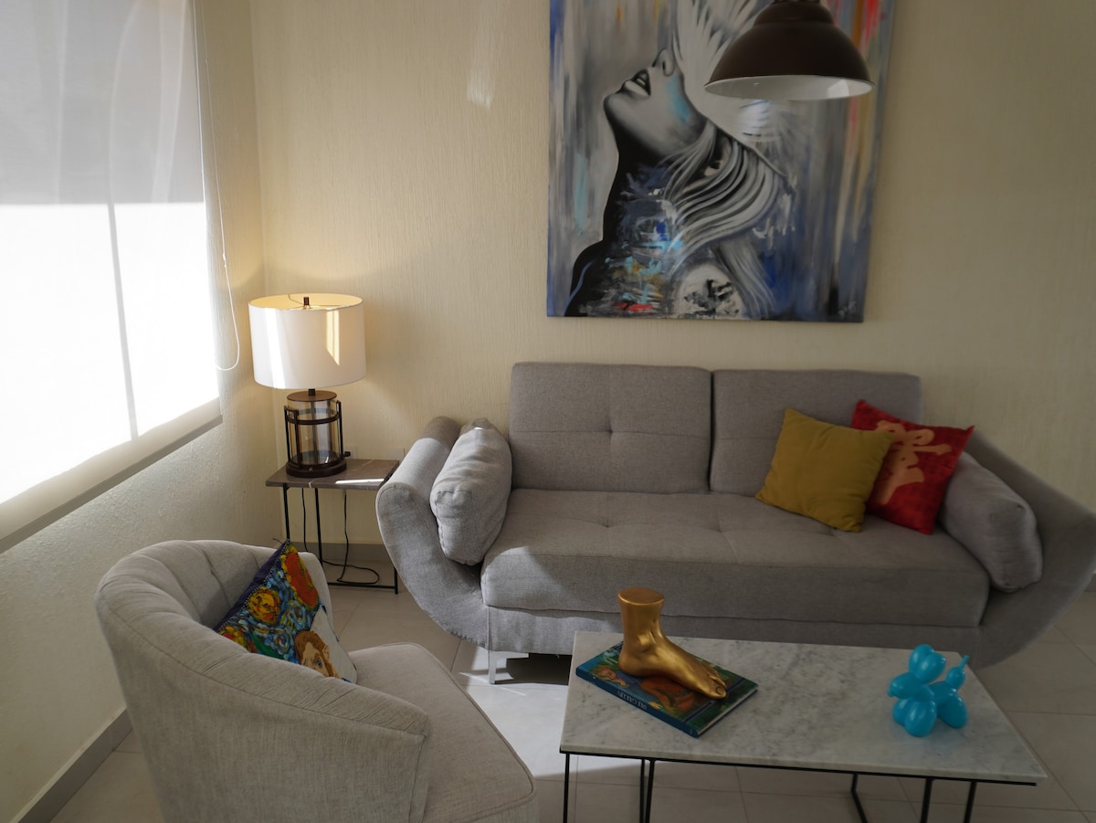 El departamento cuenta con aire acondicionado en RECÁMARA PRINCIPAL. El servicio se contrata por separado. Costo adicional de $99.00 pesos por día. Relájate en este espacio tan tranquilo y elegante. Totalmente nuevo con dos habitaciones. Espacioso para 4 huéspedes. Con opción para un 5to [con costo extra]. Con amenidades [gimnasio, ludoteca, espacio de trabajo, cine]. Excelente ubicación. En el sur de la ciudad. A 5 minutos de la plazas y supermercados. Haremos que tu estancia sea placentera.