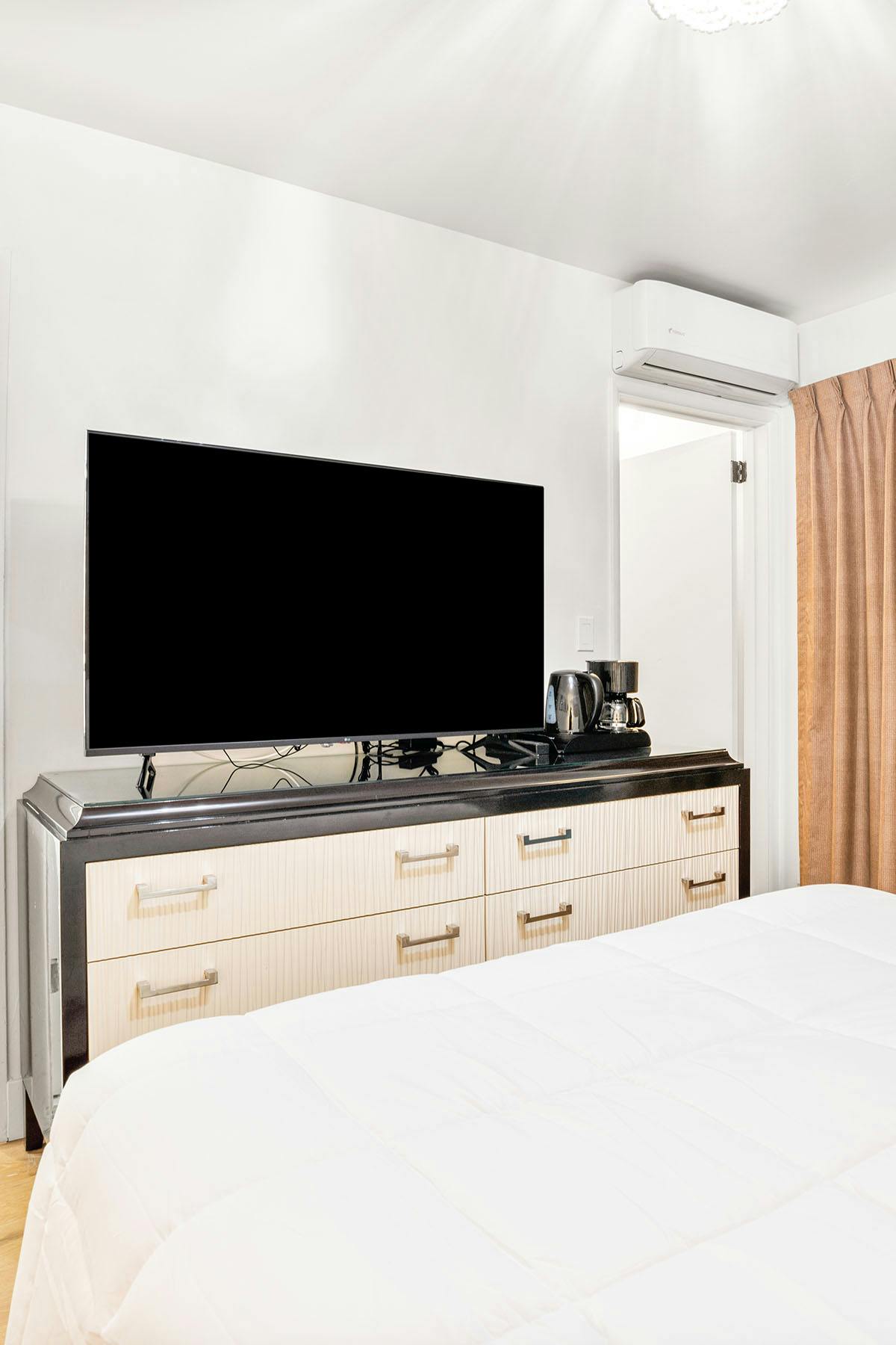 Second-floor Penthouse with 3 bedrooms and 3 bathrooms, including a large deck and fire pit This room can accommodate a maximum of 7 guests. Special note: This room has stair access only. Built in 2024 this sleek Penthouse features 2 Queen, 1 King, 1 Double, Five Star Bedrooms with hypo-allergenic bedding and wood flooring 3 bathrooms 2with walk-in showers 1 with tub Full Kitchen Spacious Deck for gathering Fire Pit Amenities Air-conditioning Free high-speed WiFi 4 Cable TV In-room safe