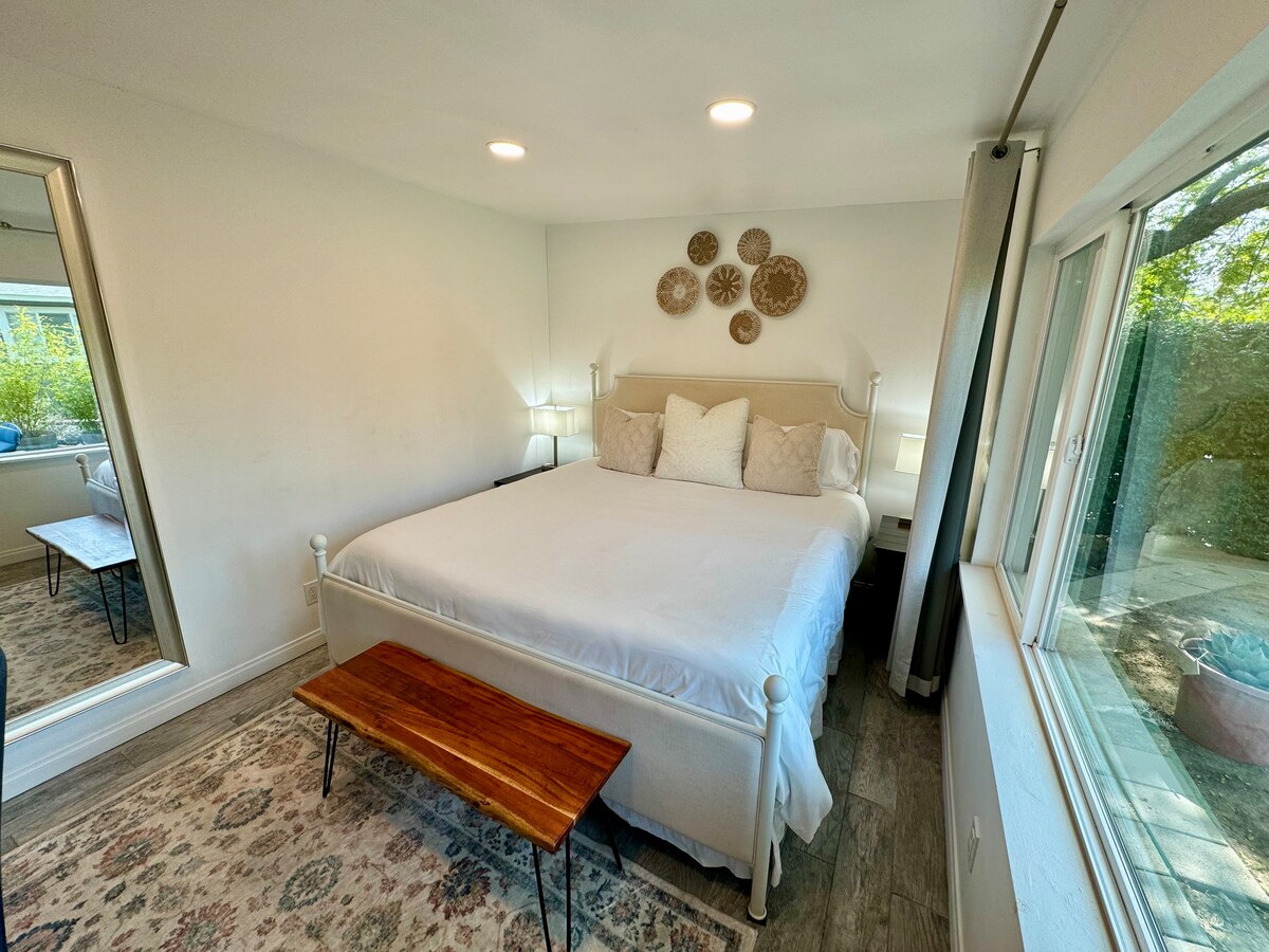 Newly remodeled bedroom (with cal king bed), attached bathroom, patio with private entrance, and self check-in. Across the street there is a nature preserve with a 1.5 mile walking path offering bird watching, Los Carneros Lake, and the historic Stow House. The house is 2-stories with 3 bedrooms and 2 bathrooms above the unit. The bedrooms above are carpeted, and we insulated the ceiling above you in an attempt to mitigate the noise, but the 60 year old floors can squeak.