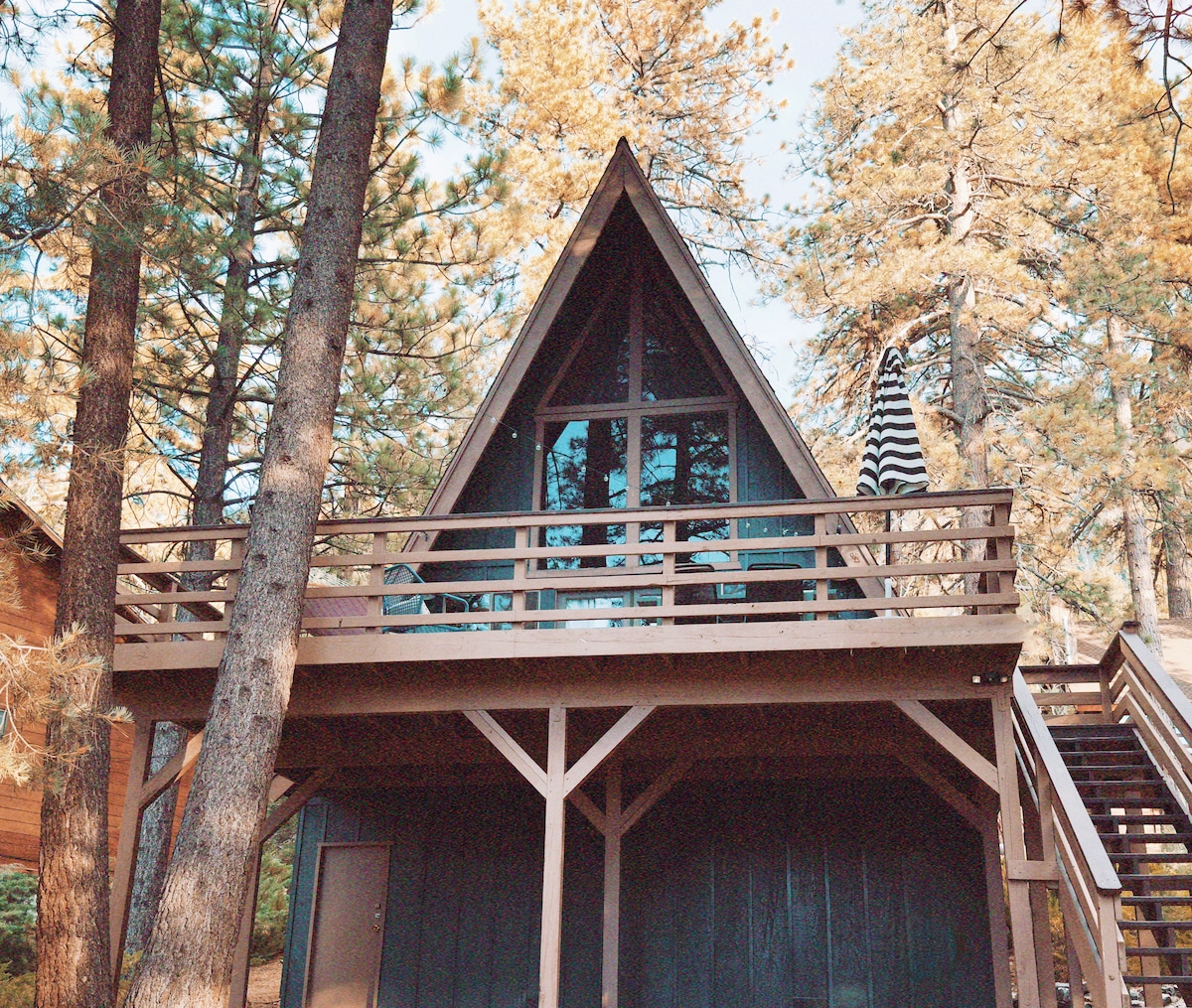 Our beautiful and rustic A-Frame cabin is exactly what you imagine when you dream of a mountain getaway. The cabin is nestled amongst the pine trees with two large decks. Inside, you will enjoy relaxing in the family room which has soaring wood vaulted ceilings and forest views from the floor to ceiling windows. You can imagine sitting in front of a roaring fire in the open style wood fireplace on winter nights and enjoying time on the deck just listening to the forest sounds.