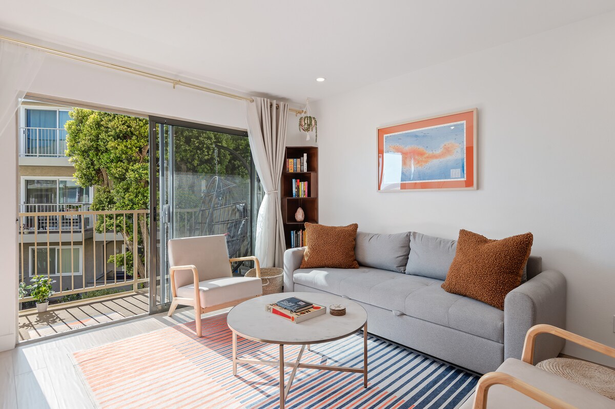 Luxury digs in the heart of fun with romantic private deck with outdoor fireplace, Rivera views, steps to beach, Funk Zone and restaurants. Artist-designed, boho chic one bedroom apartment with sofa bed in living room, sleeps 4, well stocked kitchen, High Speed WiFi, 2 TVs, one bathroom, washer, dryer, desk/dining table, AC, Heater and on-site parking for one car. The space covers 700 square feet (65 square meters). Perfect for one or two couples who want a kitchen, living, dining and amenities.