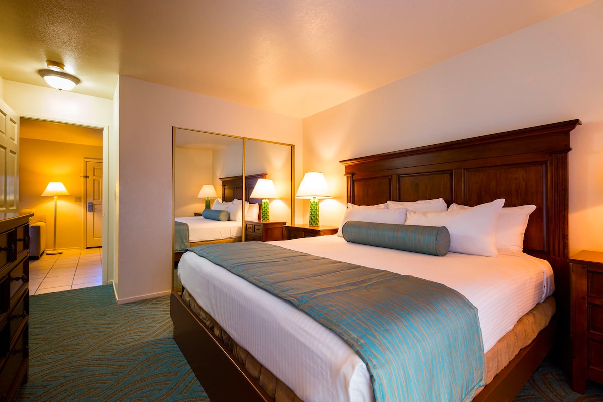 “The Danish Capital of America” welcomes you and yours to the friendly, walkable streets of Solvang, California. This spacious one-bedroom resort suite measures approximately 751 square feet. You will enjoy a king bed in the master bedroom and one queen sleeper sofa in the living room. Additional amenities include a fireplace and a full kitchen with dining area. Maximum occupancy is four. Private sleeping area sleeps two. Resort has pool, hot tubs , fitness room and game room.