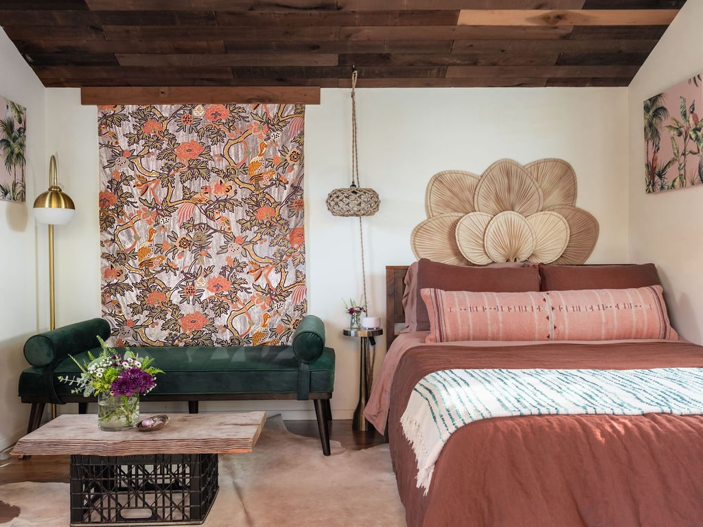 Ask how to save 20%! Welcome to the Boho House Collective! A healing luxury hostel nestled in the lush garden oasis of a residence. Enjoy a garden room w/ private access, full bed, desk, WIFI & shared bathroom. Access to a shared modern home, kitchen, WD & spa. Communal hot tub, infrared sauna, cold plunge, tea lounge, outdoor shower & fire pit. Enjoy the Barbara Romain art gallery, instruments, chickens, or our on-site events. Near downtown, beaches, UCSB & the Bowl. Pets <25lbs welcome.