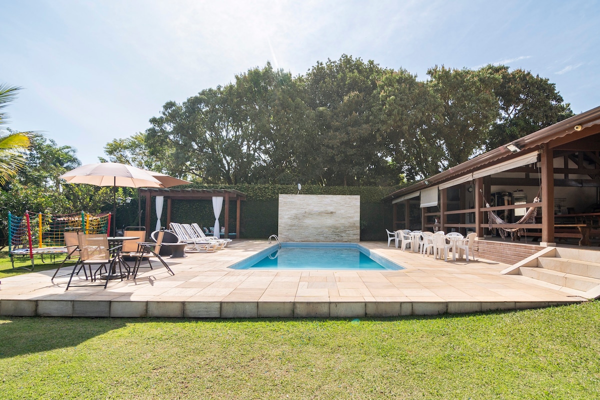 Área total de 2.000 m², toda murada. Segurança, privacidade e tranquilidade. A casa sede possui 3 quartos, 1 cozinha, 1 banheiro interno, 1 sala de estar (com ventiladores) e telefone. Piscina Maior: 8,0 x 4,0m c/ cascata .] Piscina Menos: Meia Lua c/ 2,0 m diâmetro e hidromassagem. Salão festas c/ 45 m²: churrasqueira, pia, mesa, ventiladores, exaustores e freezer. Estacionamento para 16 carros. Banheiros externos (masc./fem.) próx. a piscina. Campo Volei e Futebol: grama. Mesa de bilhar.