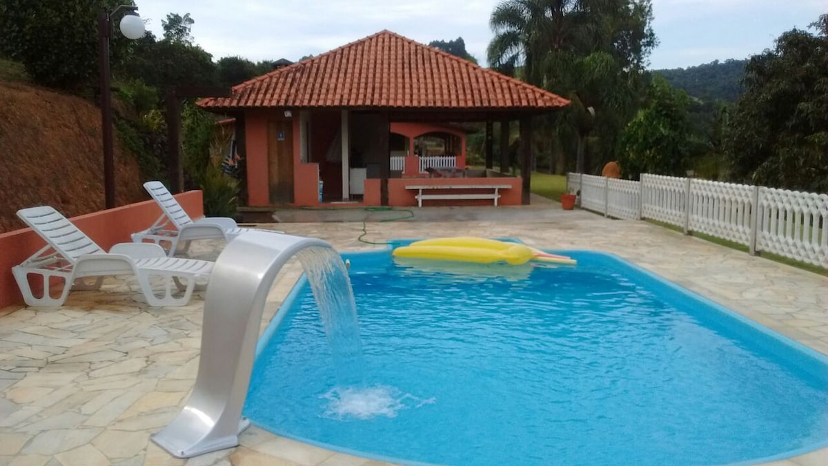 Linda chácara de mil metros com piscina, ampla área de lazer com churrasqueira, fogão e forno a lenha, sala de jogos com mesa de bilhar, excelente local para descanso e lazer, região muito tranquila e aconchegante. Localizado a apenas 7 km do centro de Guararema. Casa equipada com todos os utensílios necessários. Ótimo para famílias com crianças.