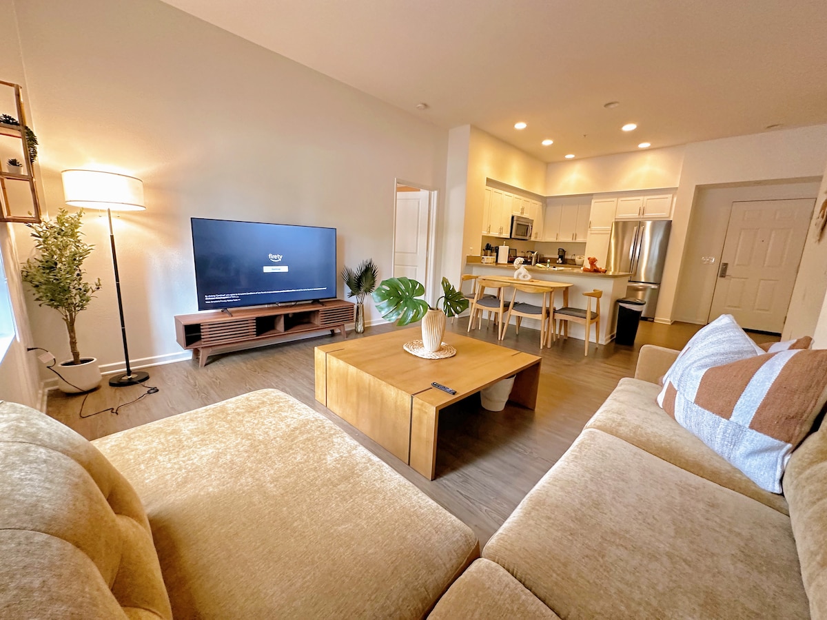 A modern wonder w/ stainless steel upgraded appliances. A high end luxury complex. Approximately 925 sq ft. Cali KING Bed. Smart 55” TV in the bedroom. A 65” Smart TV in the living room so you can log into your Smart TV Apps. Private patio. In unit washer/dryer (detergent). Perfect for a family or couple getaway, business trip or long stay. Always clean and ready when you arrive. Prime location in Irvine near 405 freeway.