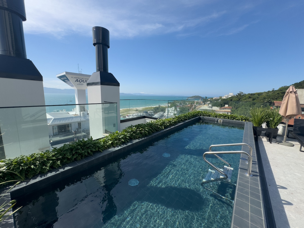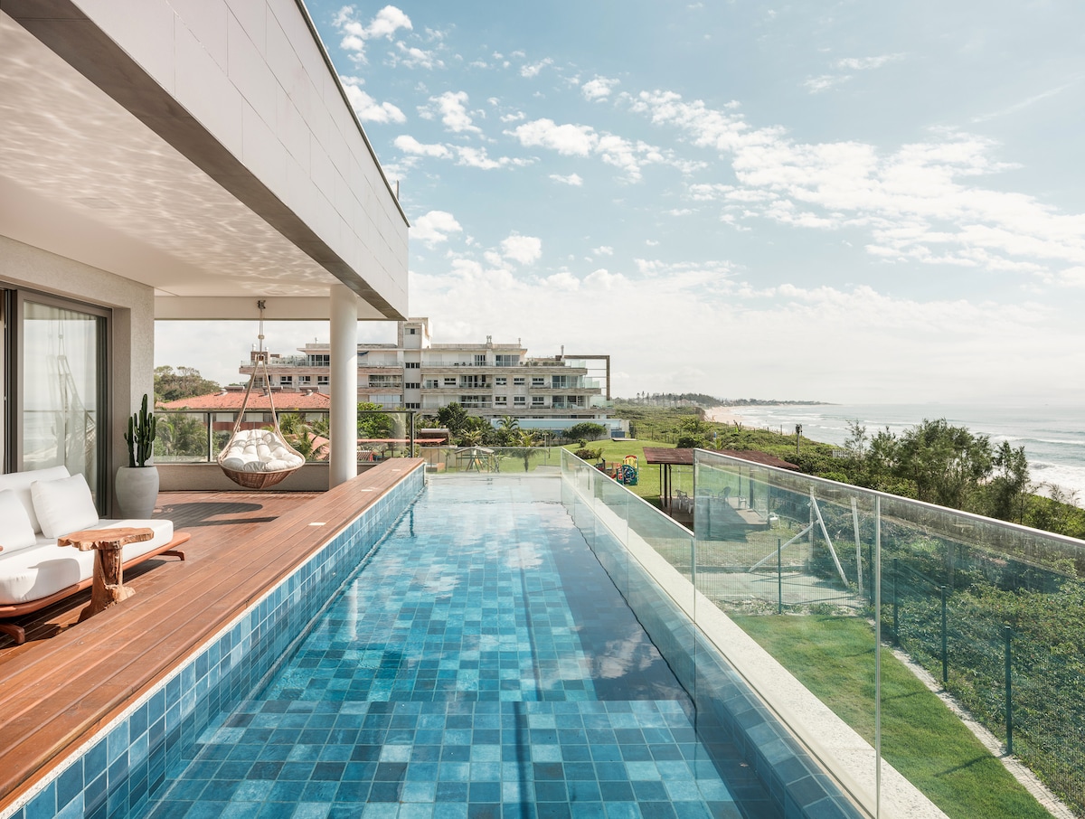 Cobertura de frente pro mar, Ocean front Penthouse, com decoração moderna e muitos detalhes que vão fazer você sentir um gostinho da ilha de Bali estando em Florianópolis. Já imaginou desfrutar da vista da ilha do Campeche até a Joaquina relaxando em uma rede ou curtindo bons momentos dentro da piscina com borda infinita? Ofereça um churrasco para os amigos enquanto a brisa do mar torna o ambiente ainda mais confortável. Esses e muitos outros detalhes fazem desse um espaço mais que especial !