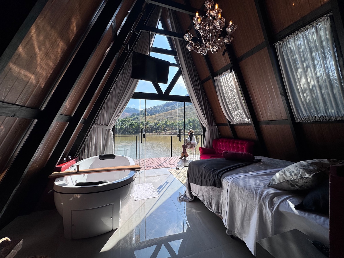 Chalé Céu da Colina – Refúgio com vista da montanha ao mar. Localizado no Sítio Vale Encantado, Palhoça–SC, a 1 km da BR-101, em estrada de chão tranquila. Situado na cobertura da pousada, é ideal para casais e oferece uma vista deslumbrante. Ambientes: hall de entrada, área home integrada, cozinha completa e sacada com balanço. Comodidades: banheira aquecida com vista, roupas de cama e banho, telescópio e lareira externa. Próximo a cachoeira e às principais praias da região sul.