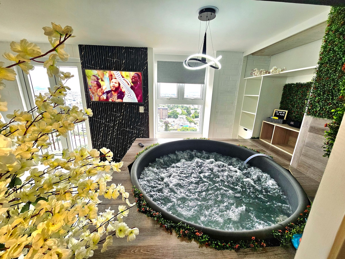 Jacuzzi en la Habitación totalmente privada. Disfruta de una experiencia con estilo en este alojamiento en la mejor area de la ciudad, a pocos metros del aeropuerto. Con un balcon con jacuzzi, nuestra suite de lujo tiene una vista impresionante donde veras los aviones aterrizar. Es una muy buena opcion para ti para quedarte, tiene un estilo moderno, area para home office, nunca te aburriras mientras trabajas, conocelo!!