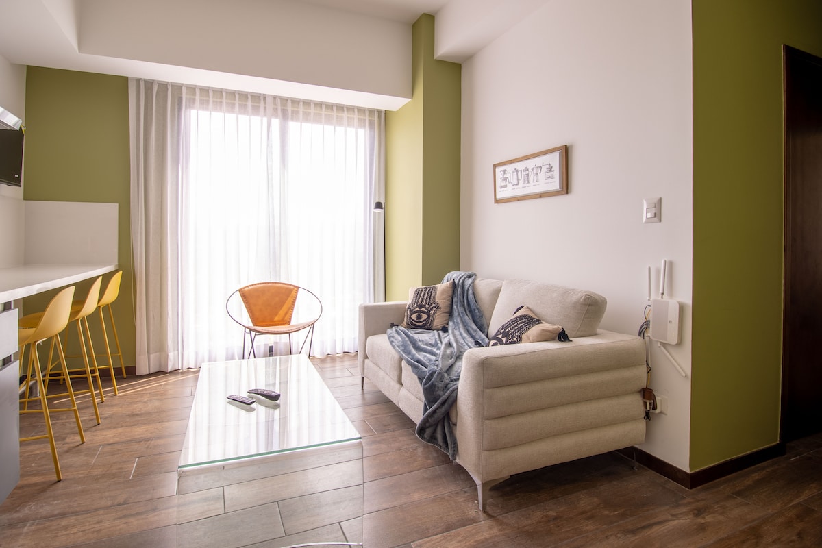 Elegante y moderno apartamento/Suite en una excelente ubicación a centros comerciales, plazas financieras, restaurantes y diversión en la zona viva, puedes movilizarte a pie o en vehículo. Todo lo que desees lo encuentras a pocos minutos de nuestro espacio. Disfruta de una vista espectacular a la diagonal 6, desayunando desde el balcón o bien descansa en una cómoda cama tamaño Queen, ¿ Pendientes ? cuentas con un moderno escritorio de madera con lampara si deseas avanzar.