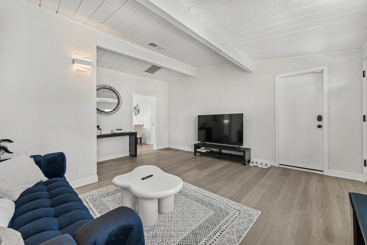 Our detached guesthouse is centrally located in DTSJ near Japantown, features a king-sized, ultra-comfortable bed and cold mini split A/C system in the bedroom that guarantees a restful night's sleep. A fully equipped kitchen for chefs and for those who need to work during their stay, an automatic ergonomic sit-stand desk. The outdoor oasis includes a huge 65 inch Smart TV, ambient lighting, outdoor ceiling fan, propane fire pit, and dining and lounging area. Street parking is free and ample.