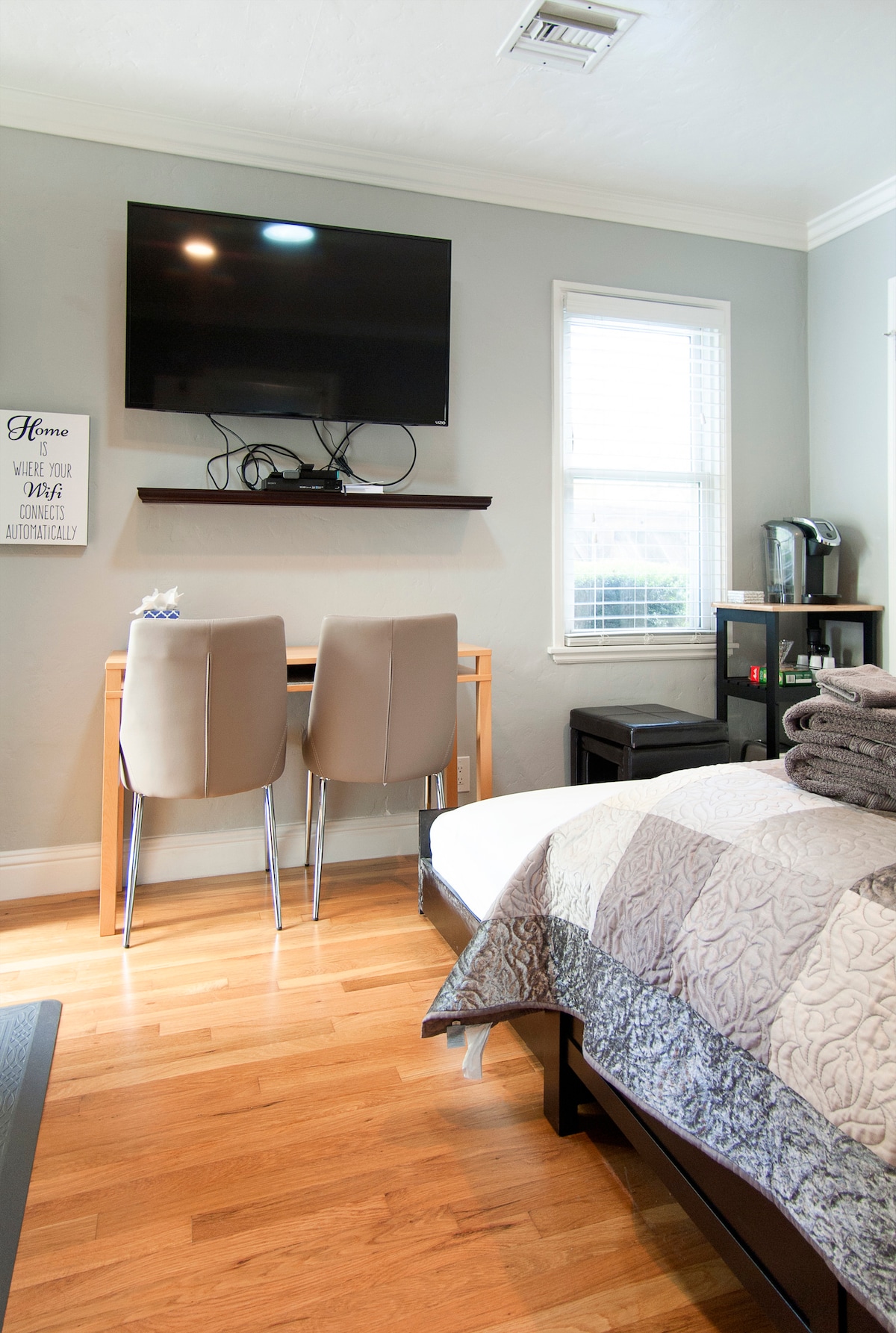 Close to all the action downtown San Jose has to offer, our renovated suite was designed with beauty and comfort in mind. You'll have a private entrance and a front porch all to yourself. This modern/luxurious home features a large living room/dining/kitchen/work area combo, dramatic bay windows, a textured stone wall fireplace, modern amenities, a cozy bedroom, specially commissioned artwork, laundry, and spa-like bathroom - a home away from home.