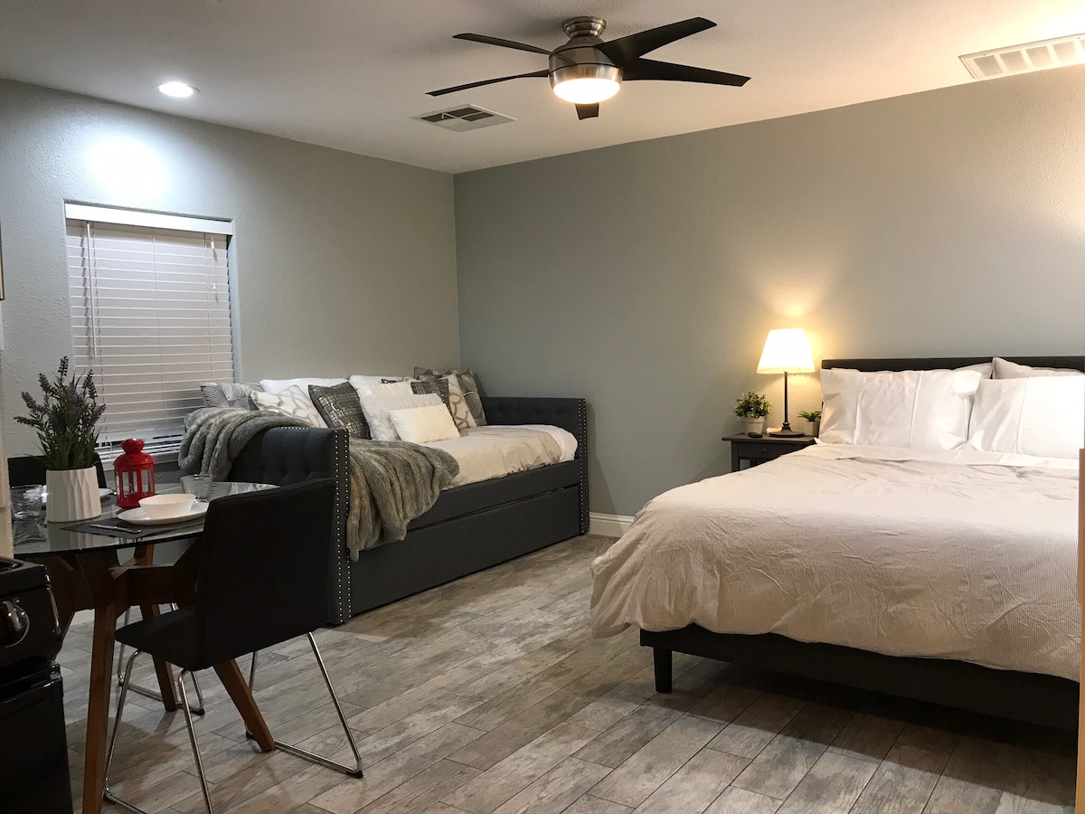Nicely remodeled designer private studio unit. High speed internet 1200 Mbps and 4K Roku-enabled TV Separate external key-code entrance. Separate heating and air conditioning control, handheld remote. Desk area. Spotless attached bathroom. Cathedral wooden ceiling. Super comfortable queen bed, comforter, padded headboard. Zoned, dimmable lighting. Small kitchenette area with counter, microwave, refrigerator, sink, utensils. Friendly, responsive hosts.