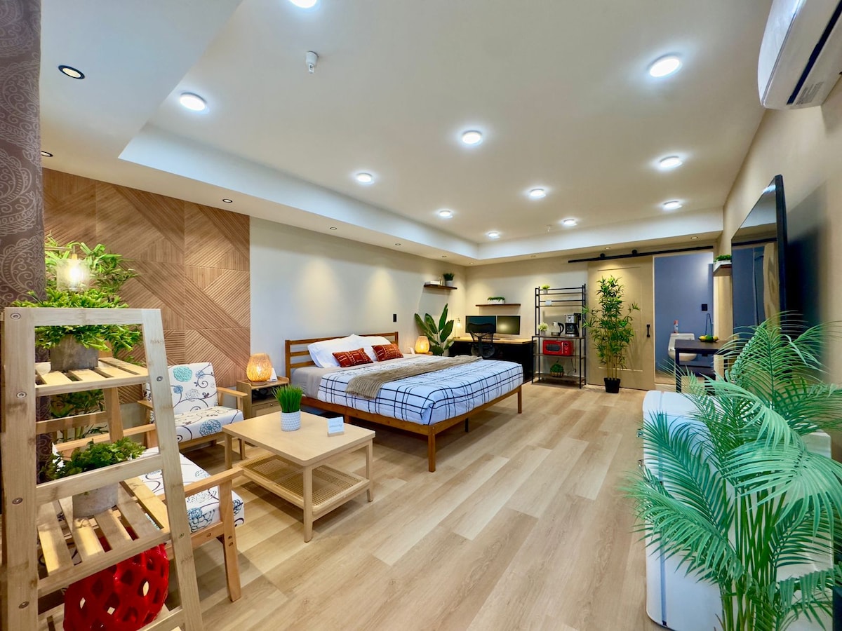 Our detached guesthouse is centrally located in DTSJ near Japantown, features a king-sized, ultra-comfortable bed and cold mini split A/C system in the bedroom that guarantees a restful night's sleep. A fully equipped kitchen for chefs and for those who need to work during their stay, an automatic ergonomic sit-stand desk. The outdoor oasis includes a huge 65 inch Smart TV, ambient lighting, outdoor ceiling fan, propane fire pit, and dining and lounging area. Street parking is free and ample.